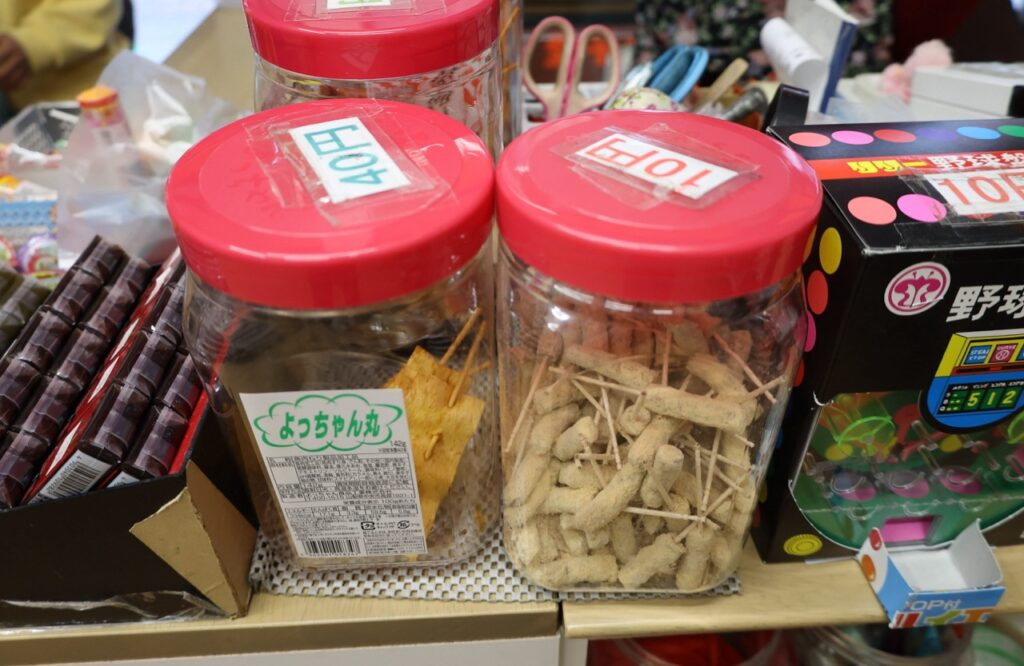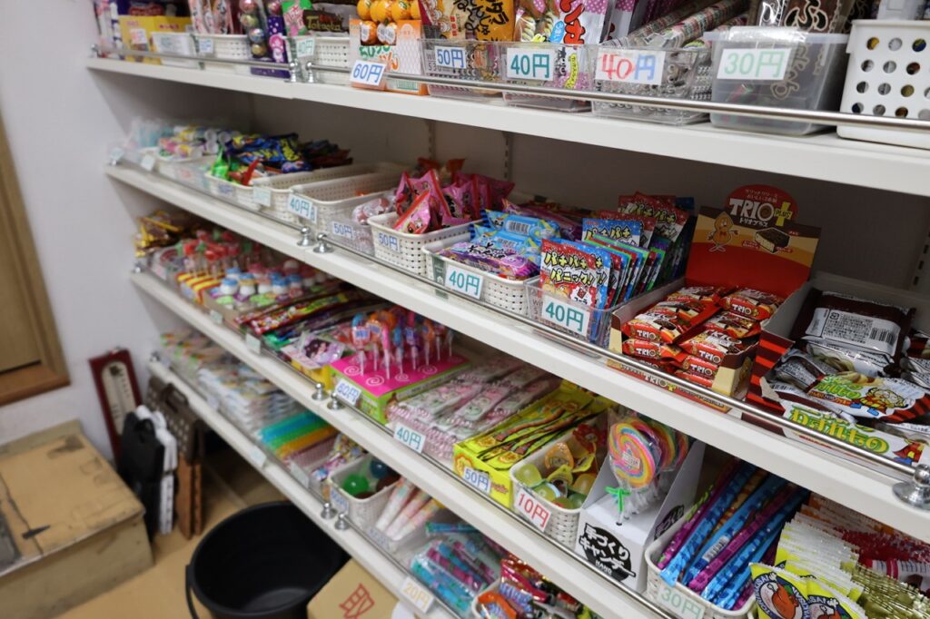 駄菓子の品揃えは豊富です。10円から楽しめる昔ながらのゲームも数台置いてあって大人もついつい没頭してしまいます。ゲームで獲得したコインは1枚10円分として店内で使用できます。