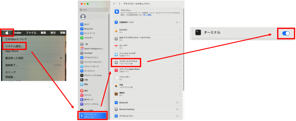 この時、今回の記事でも述べましたターミナルへの権限付与を以前まで怠ってしまってました。
